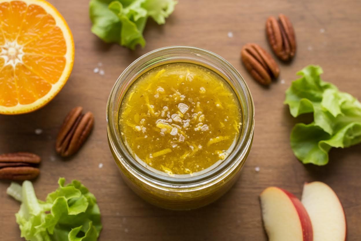 אנחנו חיים בעידן שבו המדפים בסופר מלאים בבקבוקים בטעם מייפל, אבל כאן השימוש במייפל טבעי אמיתי הוא קריטי. המייפל האמיתי נותן רובד של טעם כמעט אדמתי שמתחבר באופן מושלם למרירות הטבעית העדינה של אגוזי פקאן או מלך. במקביל, מיץ התפוזים מביא את הנוזלים הנדרשים כדי לרכך מעט את העלים של הסלט, והוא עושה את זה בלי להכביד.