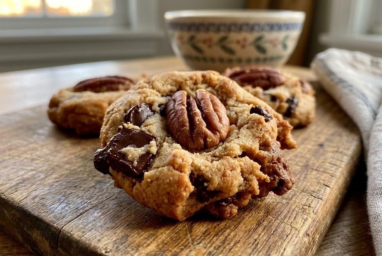 לצילום ביתי נעים, משטח של עץ בהיר או שיש בהיר יעבוד טוב מאוד. הגוונים הטבעיים של העוגיות, החום של הפקאן והזהב העדין של האפייה נראים הכי טוב כשלא מעמיסים מסביב. הרעיון הוא לא לייצר תמונה מושלמת מדי, אלא להעביר תחושה של מטבח חי, כזה שמישהו באמת יושב בו עכשיו עם עוגייה ביד.
