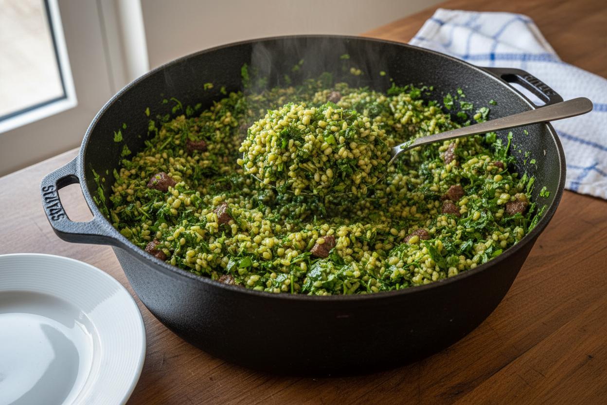 יש משהו מהפנט בלראות סיר של בחש מתבשל. הפעם הראשונה שנתקלתי במנה הזו, הייתי בטוחה שיש כאן טעות במתכון – היחס בין כמות הירק לאורז נראה כמעט לא הגיוני, כאילו מישהו החליט להפוך סלט עשבים לתבשיל קדרה. אבל ברגע שמבינים את הלוגיקה הבוכרית, מבינים שמדובר באחת המנות החכמות ביותר שיש. הבחש הוא לא סתם "אורז ירוק"; הוא ארוחה שלמה בסיר אחד, שמצליחה לדחוס כמות אדירה של ברזל, כלורופיל וסיבים תזונתיים לתוך ביס אחד מנחם. זו מנה שדורשת הבנה של חומרי גלם וסבלנות, אבל התמורה היא טעם עמוק ומרקם שאי אפשר להשיג בשום קיצור דרך.