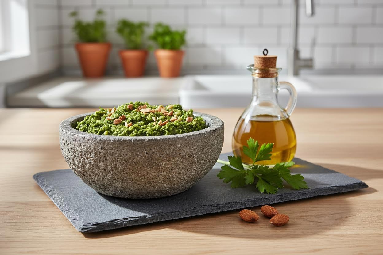 שילוב שקדים ופטרוזיליה מהווה אלטרנטיבה מקצועית ונגישה לצנובר ובזיליקום הקלאסיים. השקדים מעניקים לממרח מרקם יציב ופציך, בעוד הפטרוזיליה שומרת על רעננות עמידה לאורך זמן. מדובר ברוטב ורסטילי המתאים למטבח המודרני בזכות חומרי גלם זמינים.