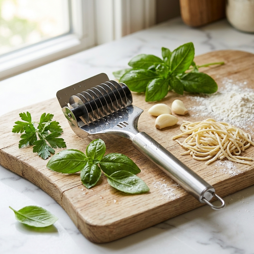 מדובר בחותכן גלגלת ידני העשוי מפלדת אל-חלד (נירוסטה) איכותית, שעוצב במיוחד כדי להפוך הכנת אטריות וקיצוץ עשבי תיבול למשימה של שניות. המבנה שלו כולל סדרת להבים חדים ומקבילים שפשוט מחליקים על הבצק או על חומרי הגלם ויוצרים חיתוך אחיד ומדויק.