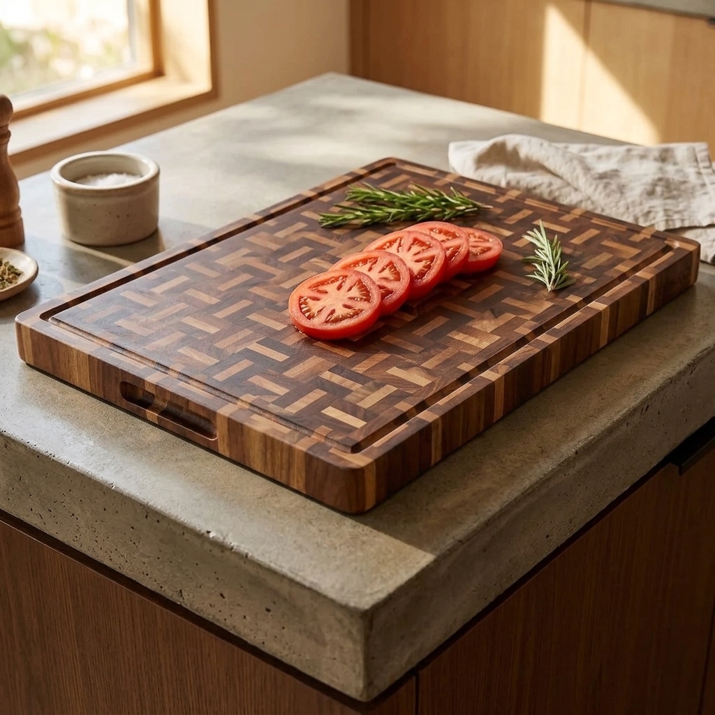 מדובר בקרש חיתוך XXL מסיבי במיוחד, עשוי משילוב מרהיב של עץ שיטה (Acacia) ואלון (Oak) בטכניקת End Grain. בניגוד לקרשים רגילים, בשיטה זו סיבי העץ עומדים בצורה אנכית. מה זה אומר מבחינה קולינרית? שסיבי העץ "נפתחים" לקבלת להב הסכין ונסגרים בחזרה, מה ששומר על חדות הסכינים היקרות שלכם לאורך זמן ומונע שריטות עמוקות בקרש.