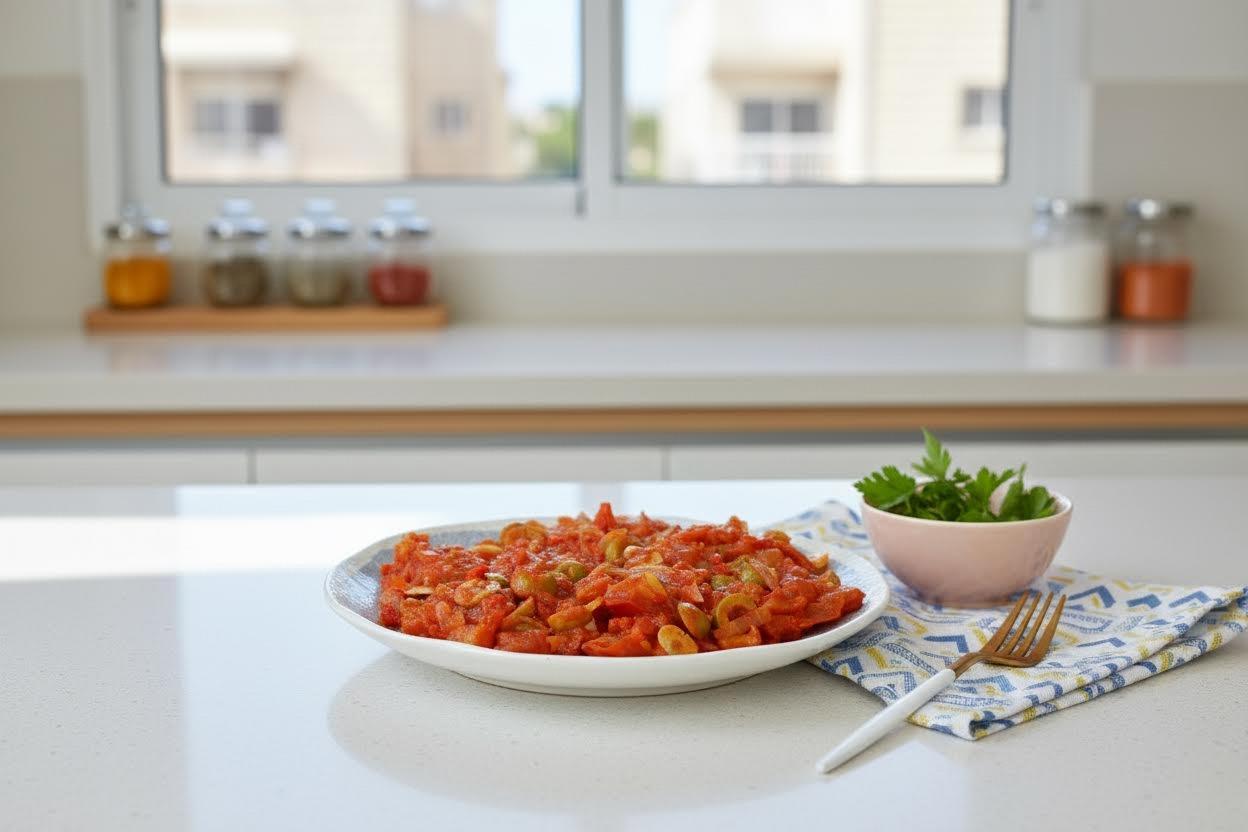 גם למרקם יש כאן תפקיד חשוב. העגבניות מתרככות ומגירות את המיץ שלהן, אבל אם מכינים נכון הן עדיין נשארות עם גוף ולא מתפרקות לגמרי. התוצאה מזכירה קצת סלט טורקי משודרג, או גרסה ביתית למטבל ים תיכוני, רק עם יותר עומק ועם זיתים שנותנים ביס מעניין בכל כמה כפות.